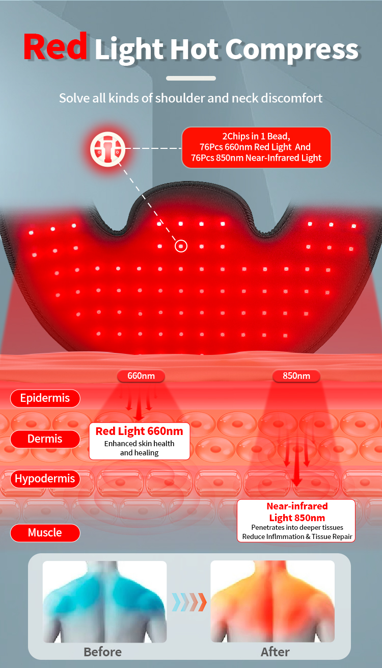 Esta terapia de luz vermelha e infravermelha próxima pode ser usada no corpo para aliviar a dor, relaxar os músculos e é versátil e portátil. A terapia LED Light Belt Belt é feita de tecido macio e de alta qualidade, que oferece um toque confortável contra a sua pele. A correia da cintura ombro leve da terapia fornece uma solução conveniente de cuidados diários para a saúde do ombro e pescoço através de fisioterapia não invasiva, especialmente adequada para indivíduos que precisam de condicionamento a longo prazo de problemas de ombro e pescoço ou buscam relaxamento.